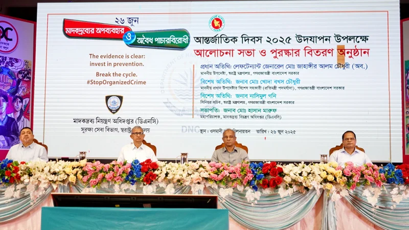 বৃহস্পতিবার সকালে রাজধানীর ওসমানী স্মৃতি মিলনায়তনে ‘মাদকদ্রব্যের অপব্যবহার ও অবৈধ পাচারবিরোধী আন্তর্জাতিক দিবস ২০২৫’ উপলক্ষ্যে মাদকদ্রব্য নিয়ন্ত্রণ অধিদপ্তর আয়োজিত আলোচনা সভায় প্রধান অতিথির বক্তব্যে এসব কথা বলেন তিনি। মাদকদ্রব্য নিয়ন্ত্রণ অধিদপ্তরের মহাপরিচালক মো. হাসান মারুফের সভাপতিত্বে অনুষ্ঠানে বিশেষ অতিথি হিসাবে বক্তৃতা করেন স্বরাষ্ট্র মন্ত্রণালয় সংক্রান্ত প্রধান উপদেষ্টার বিশেষ সহকারী মো. খোদা বখস চৌধুরী ও স্বরাষ্ট্র মন্ত্রণালয়ের সিনিয়র সচিব নাসিমুল গনি।